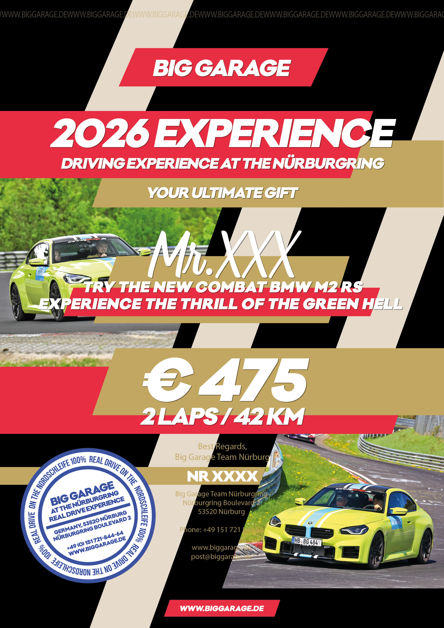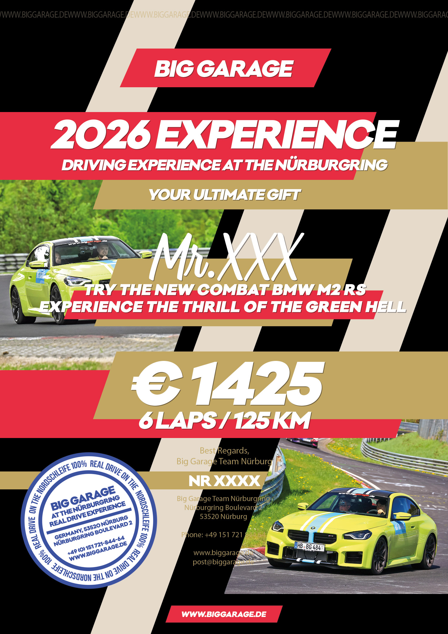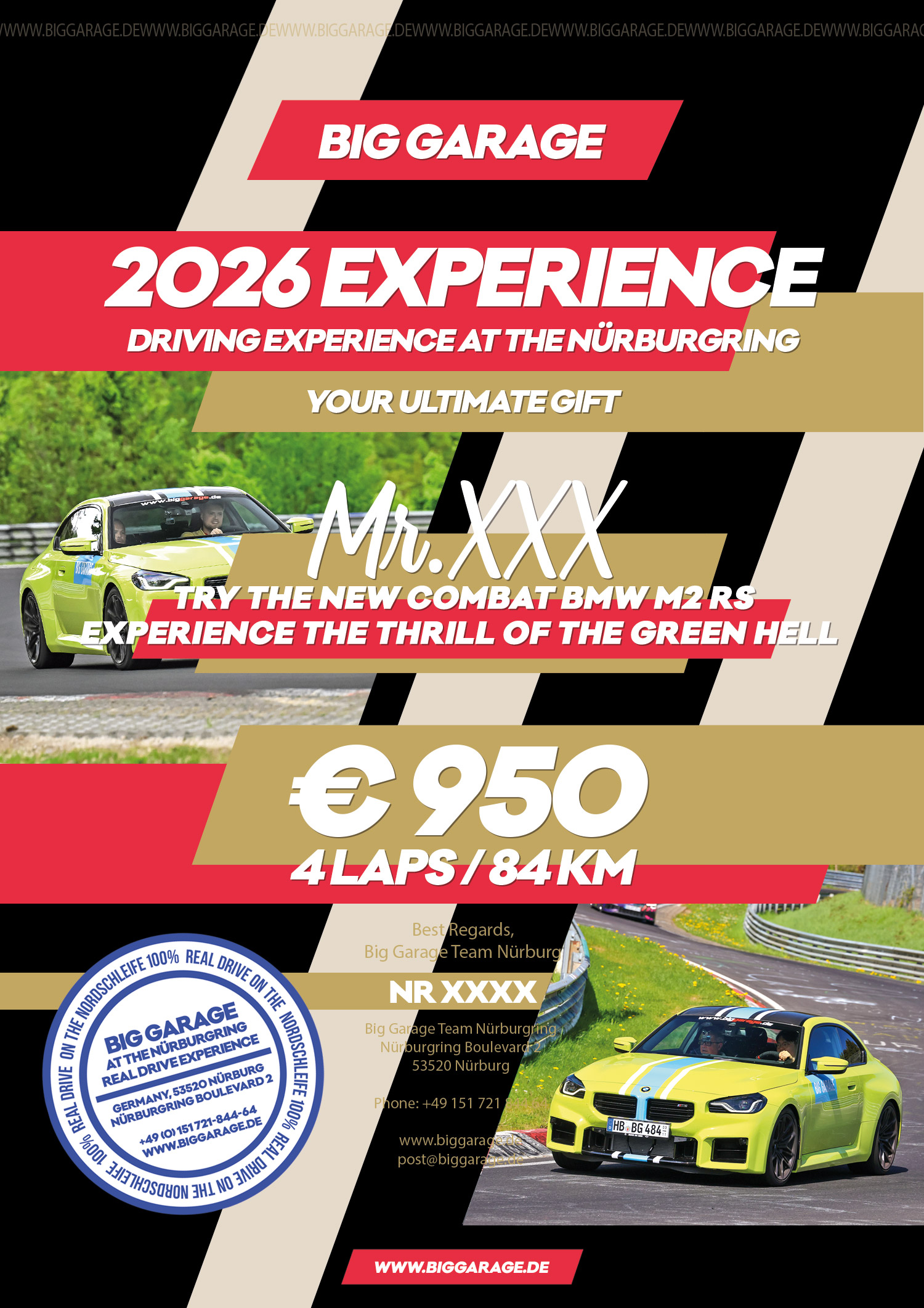 - How many laps: 20 laps / 420 km training on the Nürburgring Nordschleife with New BMW M2 RS